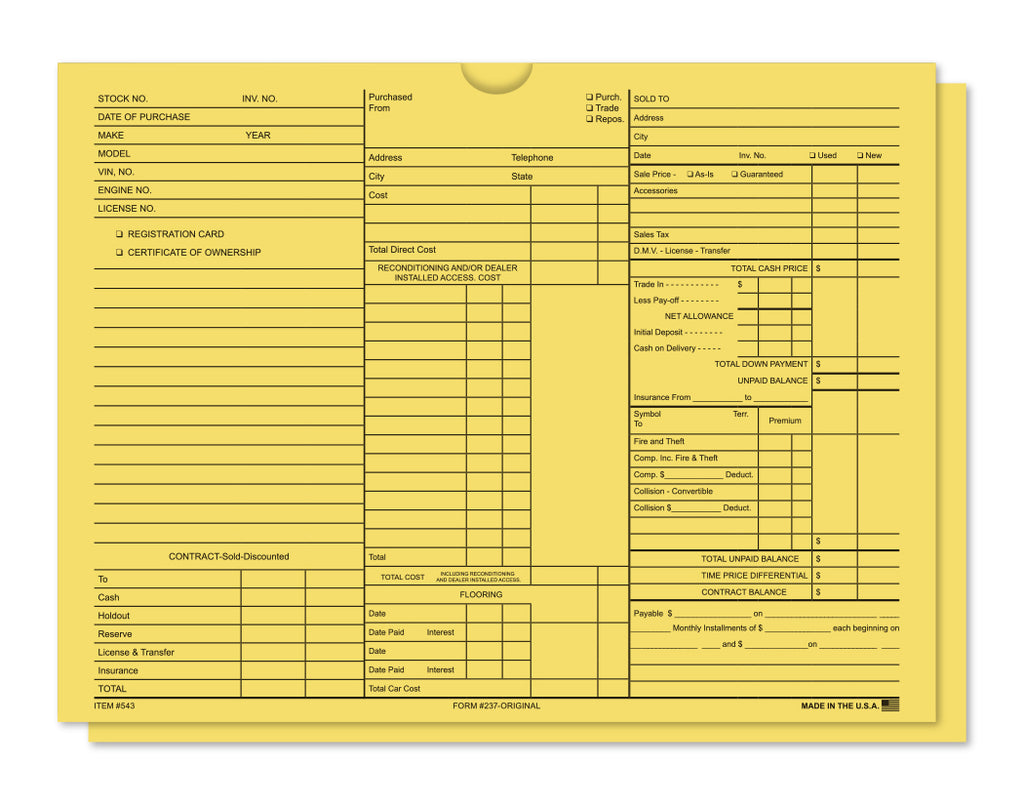Provides all information on sale of New or Used vehicle including reconditioning of used vehicle, detail of cost, and may serve as vehicle inventory record. Available in Buff only.