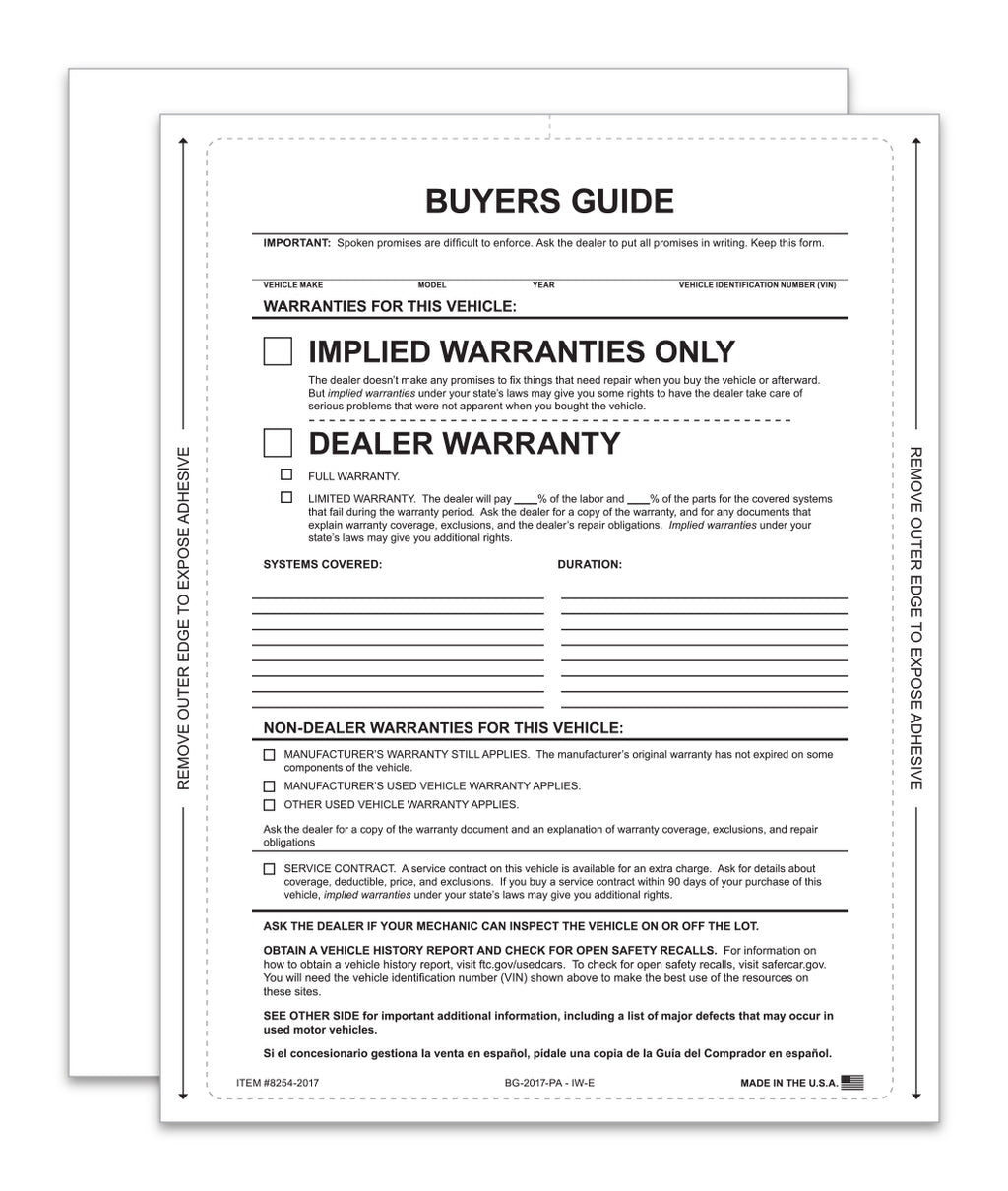 These fade-resistant Buyers Guides have “Permanent Adhesive On All 4 Sides” to adhere to the inside or outside of the vehicle window. Stay in compliance with current FTC regulations with these easy to use forms. These popular forms are laser compatible and easy to remove.