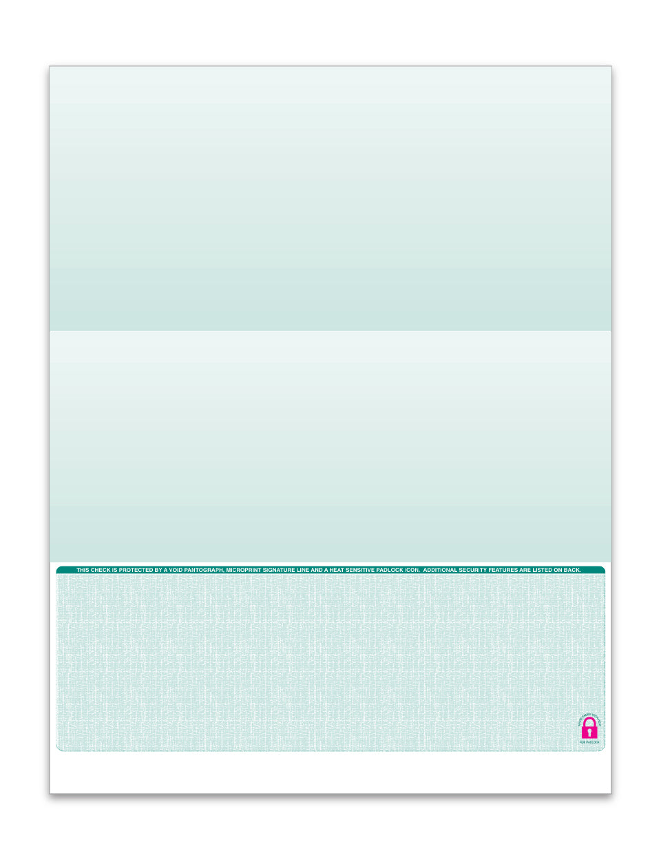 • 13 Security Features: Void Pantograph, Microprint Signature Line, Padlock Icon, Check Warning Borders, Security Back Printing, Thermochromic Padlock Icon, Coin Reactive Ink, Ghost Padlock Watermark Backer, Chemical Reactivity, Toner Adhesion, Fluorescent Fibers, Bleed Through Micr Numbers  & Bleed Through Red Arabic Numbers