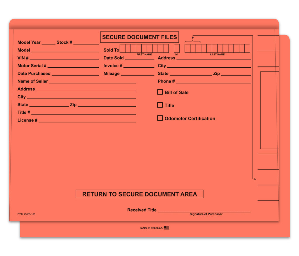 10-point colored Jacket is pre-printed with all of the pertinent information pertaining to the vehicle sale, plus lines for placing the Color-Code Labels on the side. Easy VIN and customer name identification makes this folder easy to file and easy to locate!