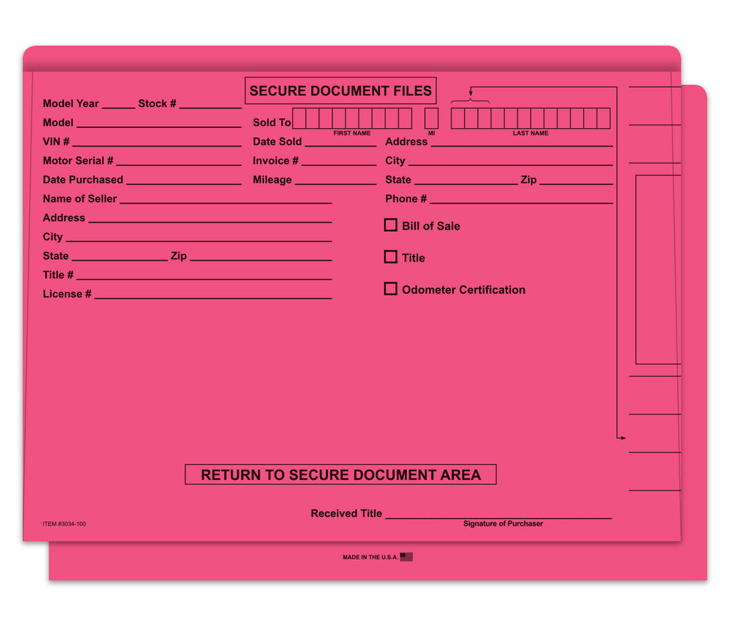10-point colored Jacket is pre-printed with all of the pertinent information pertaining to the vehicle sale, plus lines for placing the Color-Code Labels on the side. Easy VIN and customer name identification makes this folder easy to file and easy to locate!