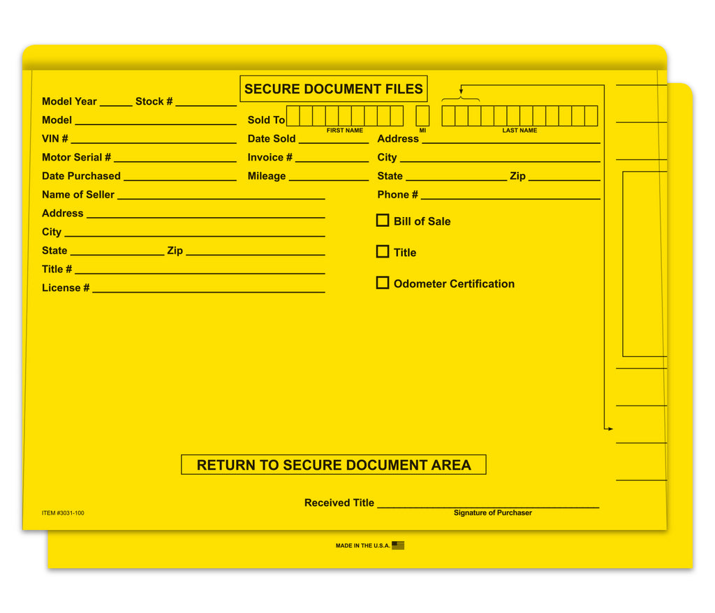 10-point colored Jacket is pre-printed with all of the pertinent information pertaining to the vehicle sale, plus lines for placing the Color-Code Labels on the side. Easy VIN and customer name identification makes this folder easy to file and easy to locate!