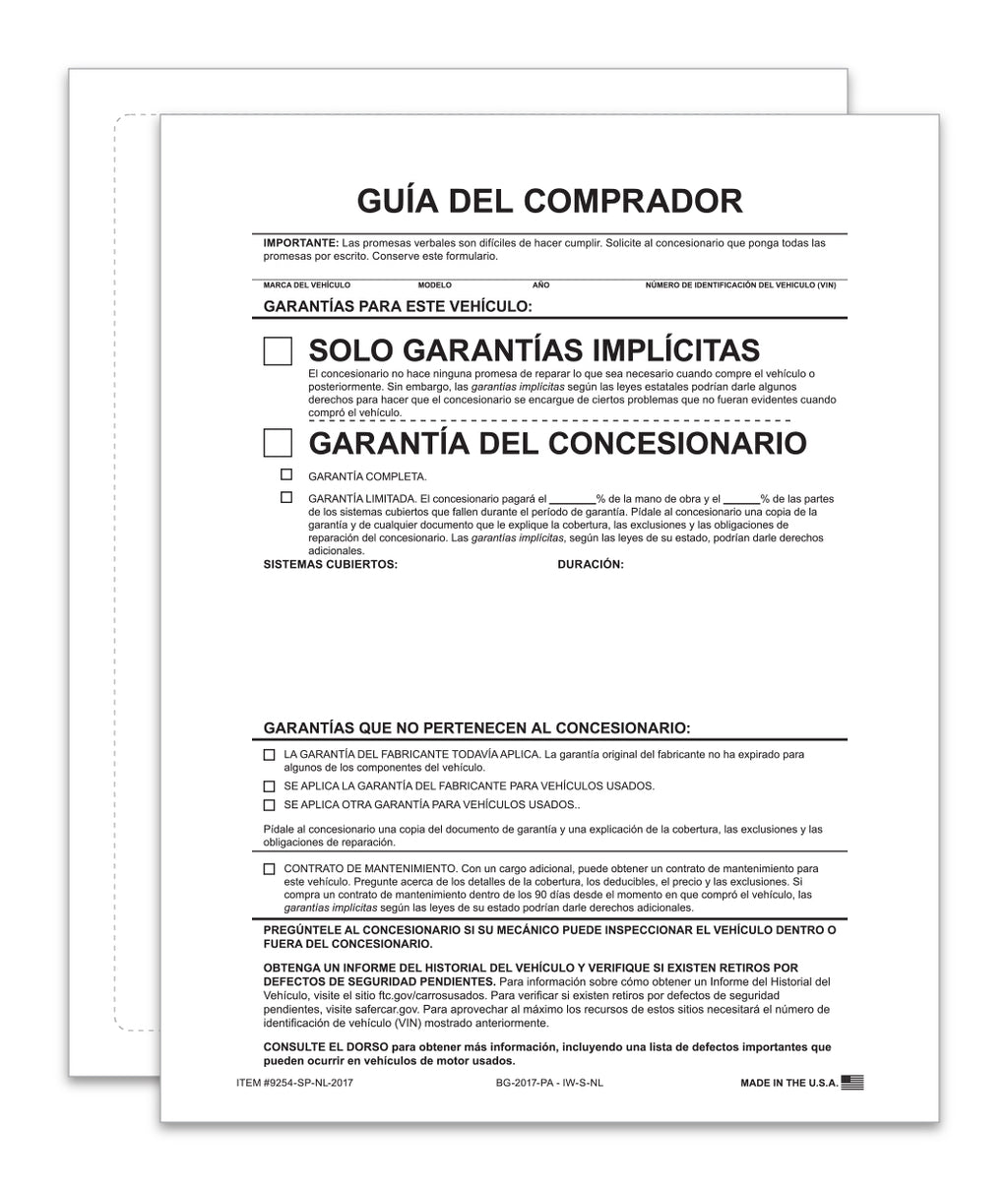 These fade-resistant Buyers Guides have “Permanent Adhesive On All 4 Sides” to adhere to the outside of the vehicle window. Stay in compliance with current FTC regulations with these easy to use forms. These popular forms are laser compatible and easy to remove.