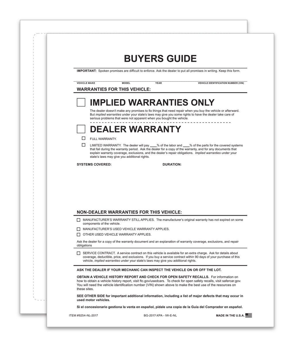 These fade-resistant Buyers Guides have “Permanent Adhesive On All 4 Sides” to adhere to the outside of the vehicle window. Stay in compliance with current FTC regulations with these easy to use forms. These popular forms are laser compatible and easy to remove.