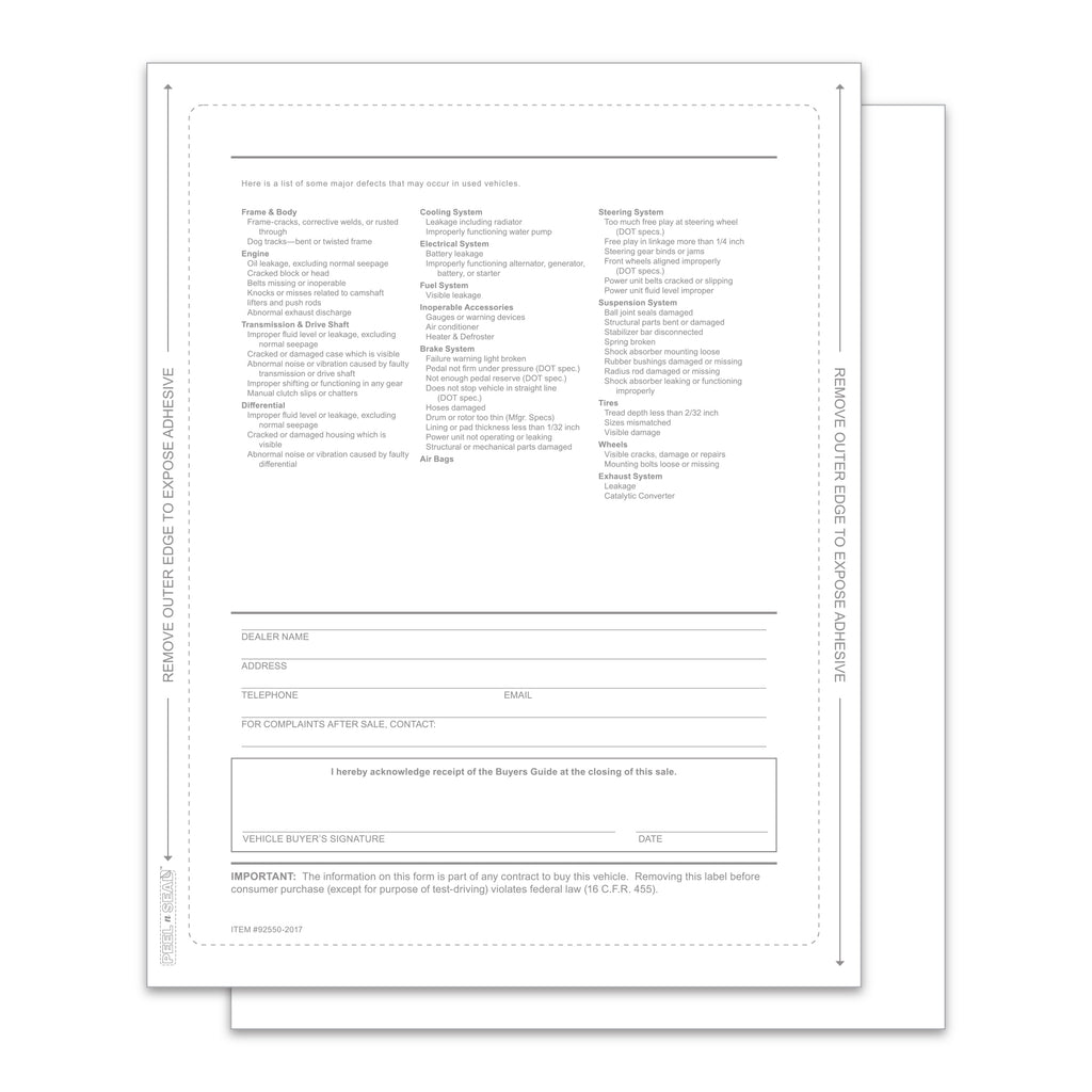 These fade-resistant Buyers Guides have “Permanent Adhesive On All 4 Sides” to adhere to the outside of the vehicle window. Stay in compliance with current FTC regulations with these easy to use forms. These popular forms are laser compatible and easy to remove.