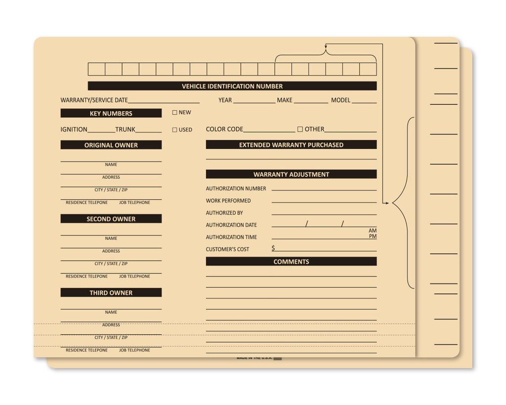 14-point, single ply, full tab folders with tab extension for easy VIN identification. Printed label placement lines for easy label application. Available with standard customer information section, plain front or custom imprinted.