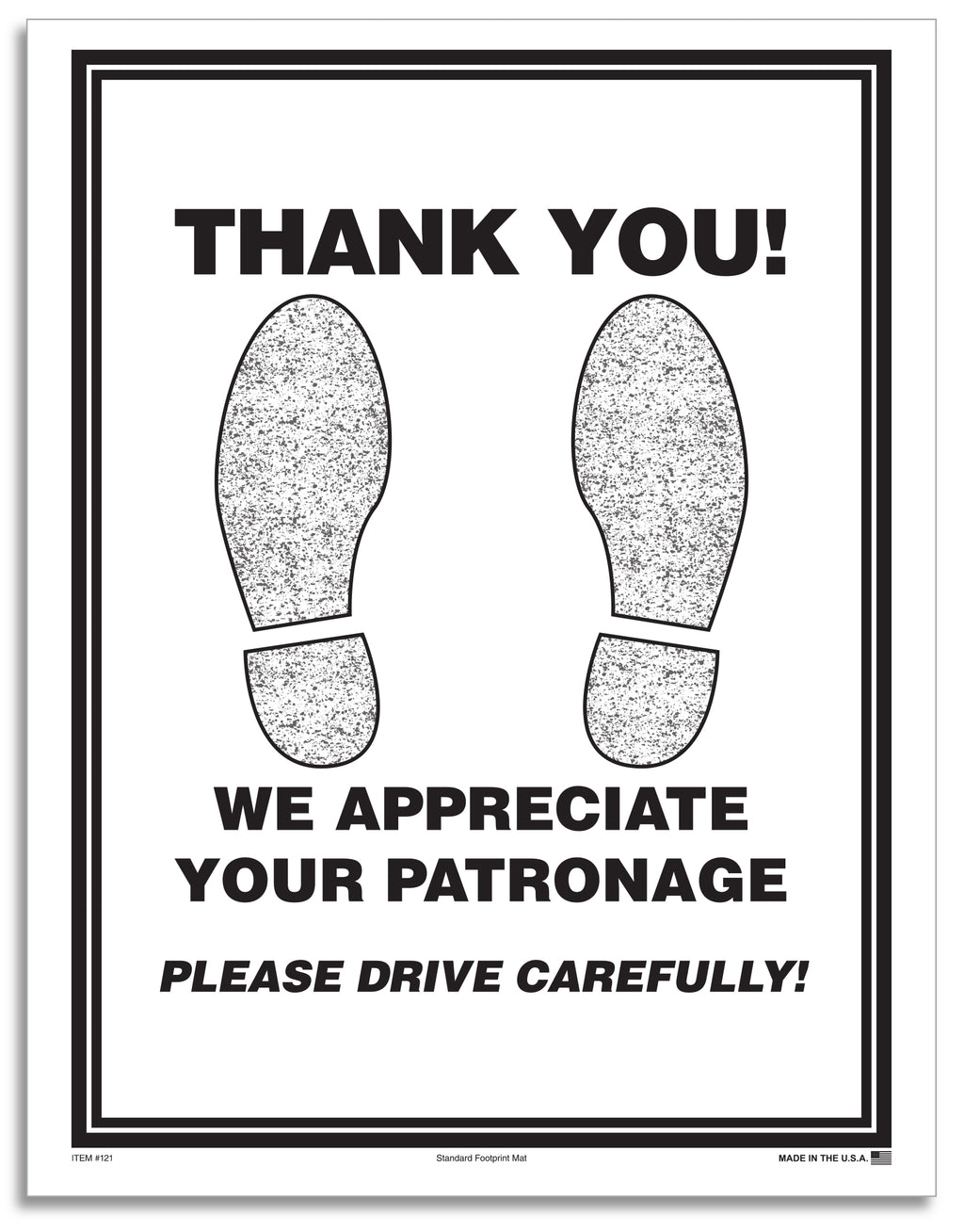 - Imprint: "Thank You!" - "We appreciate your patronage - Please drive carefully!" - Footprints