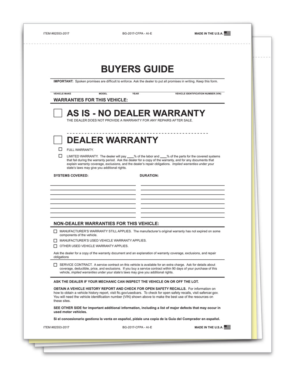 This Buyers Guide is the best of both forms! Parts 1 & 2 are for filing or customer use and part 3 is adhesive stock that seals on all 4 sided to the inside of the vehicle's window. It is also perforated for easy removal from the window.