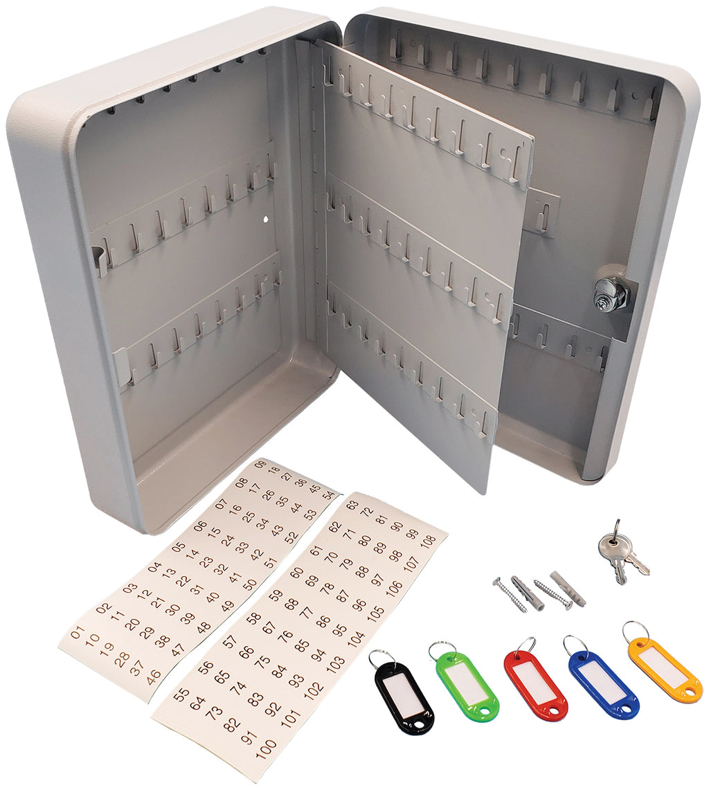 - Includes colorful plastic key fobs, key rings and numbered stickers for each hook